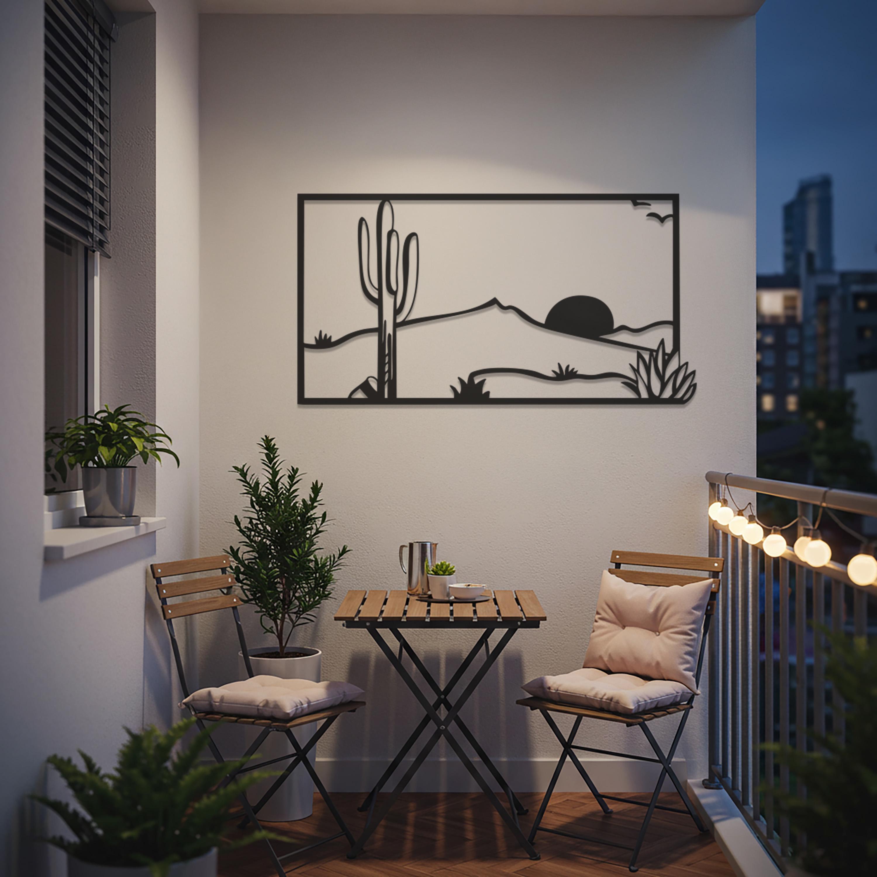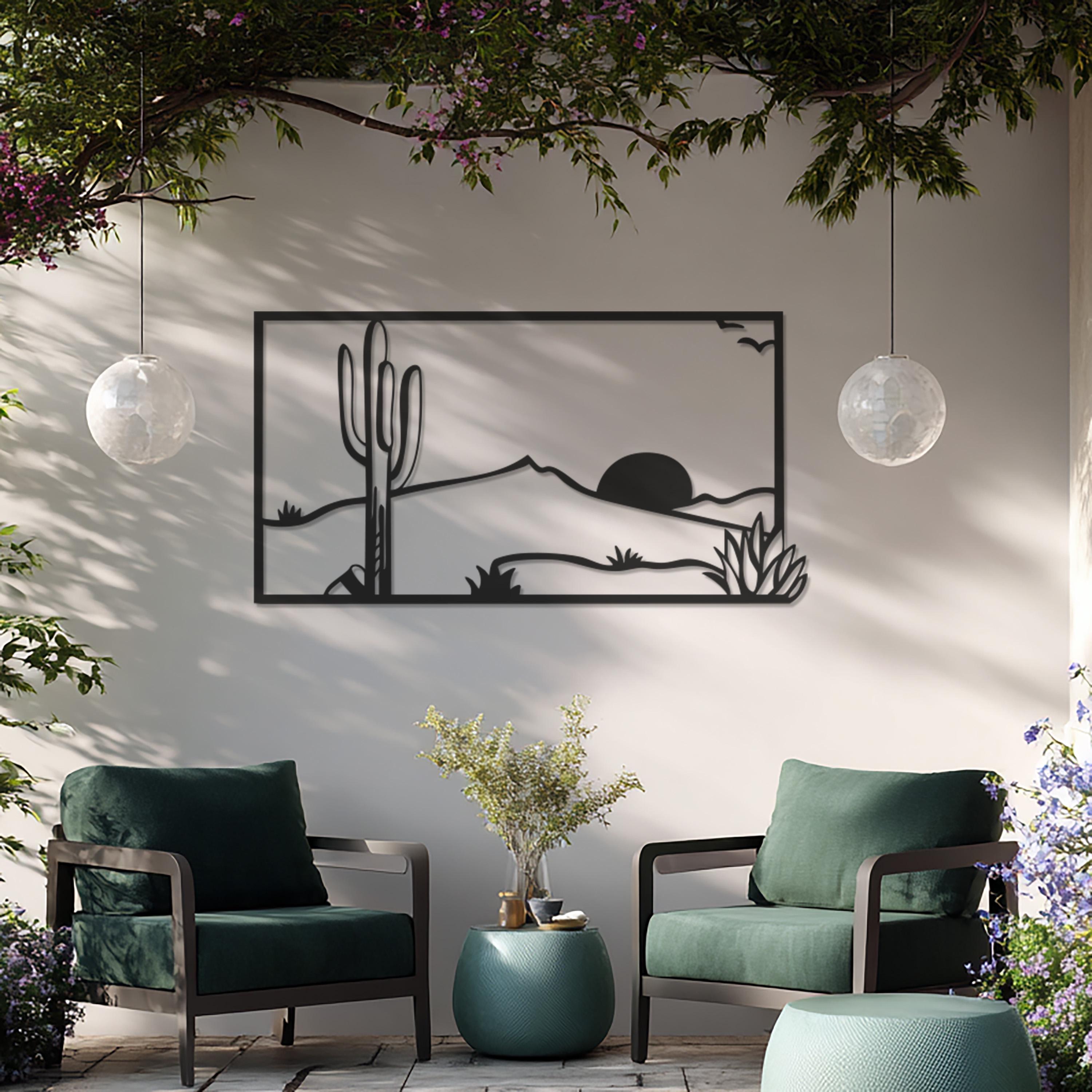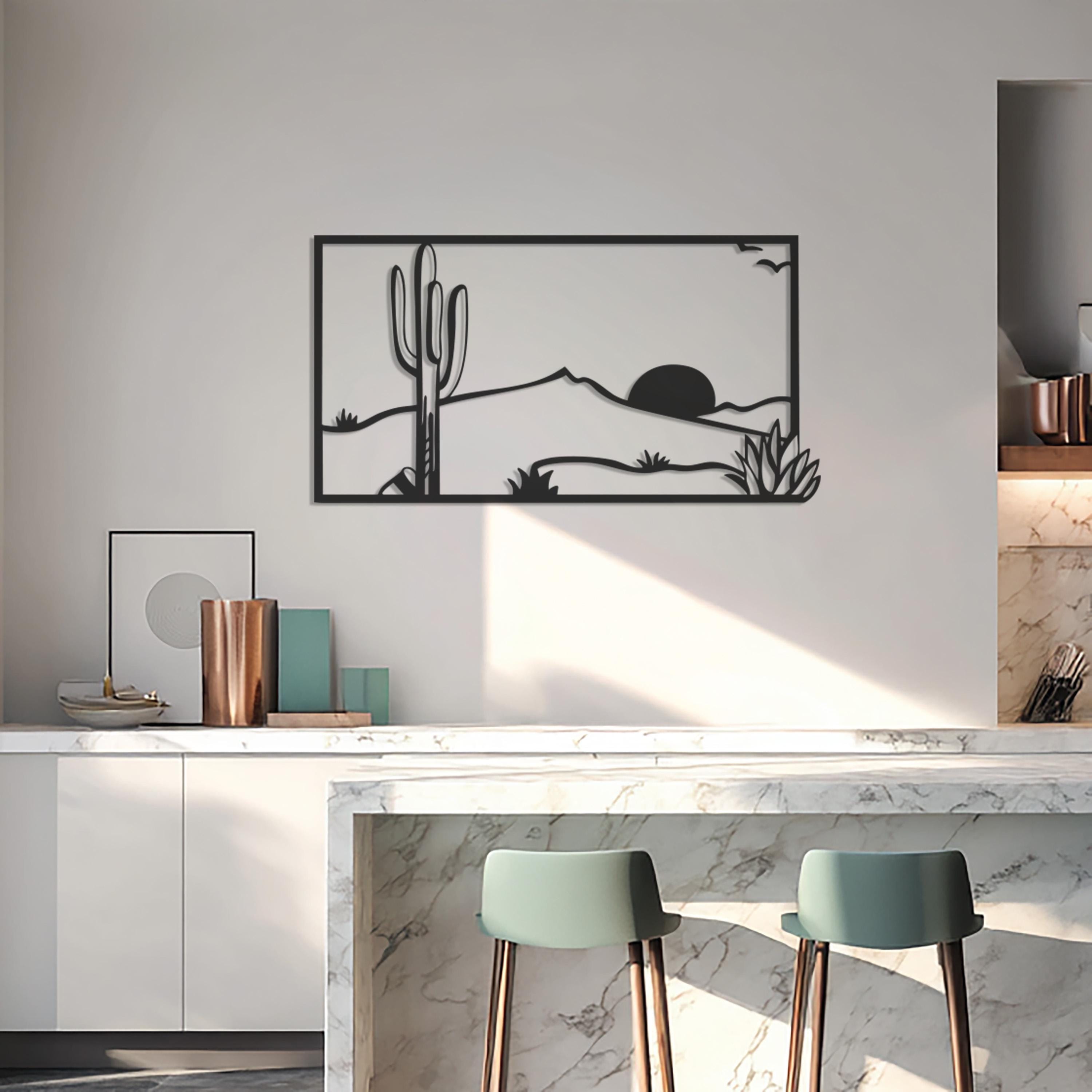 Desert Sunset Metal Wall Art, Modern Cactus Landscape Design, Minimalist Black Metal Nature Wall Decor for Kitchen or Living Room