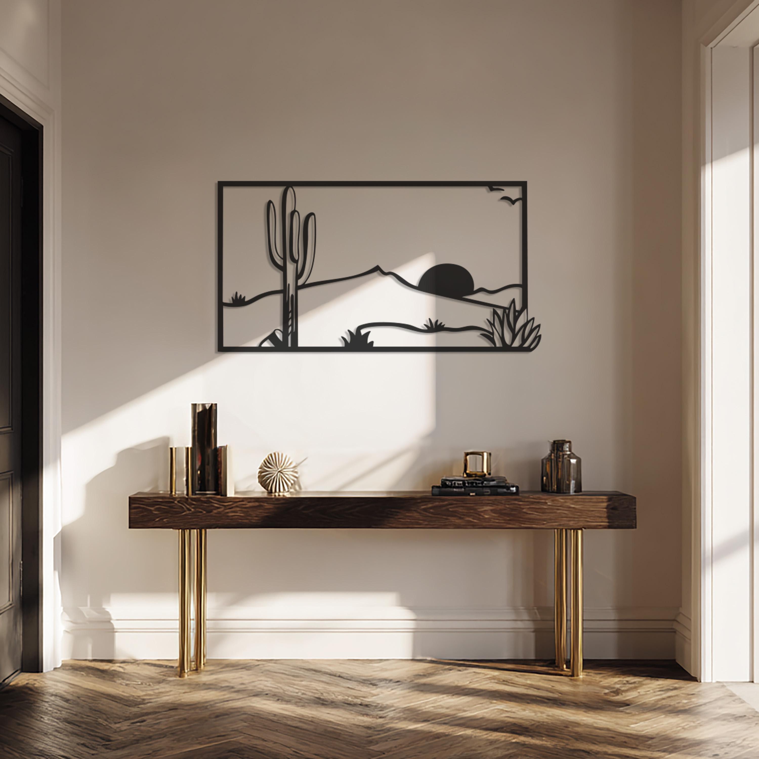 Add a touch of desert charm to your space with this Desert Sunset Metal Wall Art. Featuring a striking cactus silhouette, mountain horizon, and setting sun, this minimalist design evokes tranquility and natural beauty. Perfect for modern, boho, or rustic interiors, it brings a warm southwestern feel to your kitchen, living room, or hallway. Crafted from durable metal with a smooth black finish, it’s both stylish and timeless.