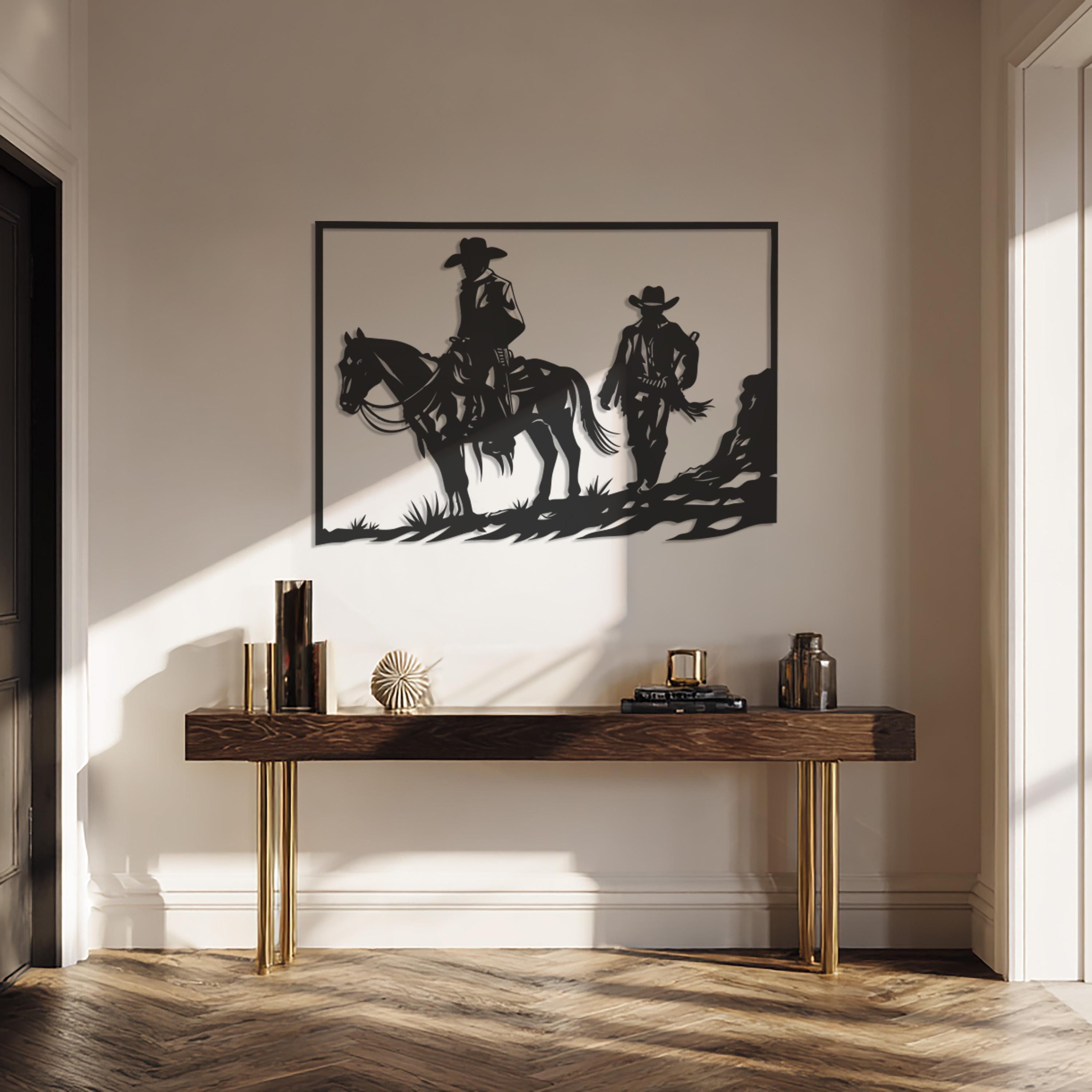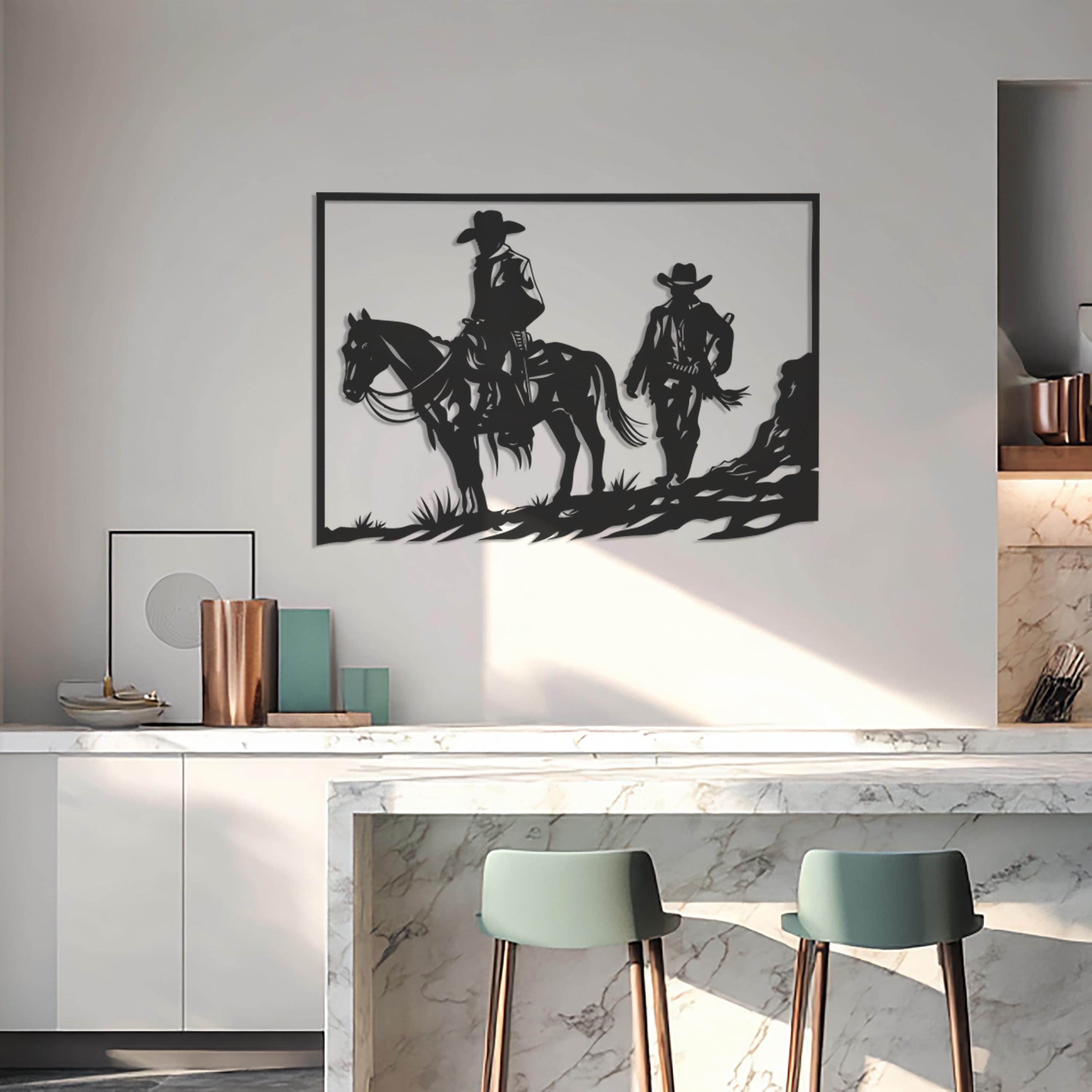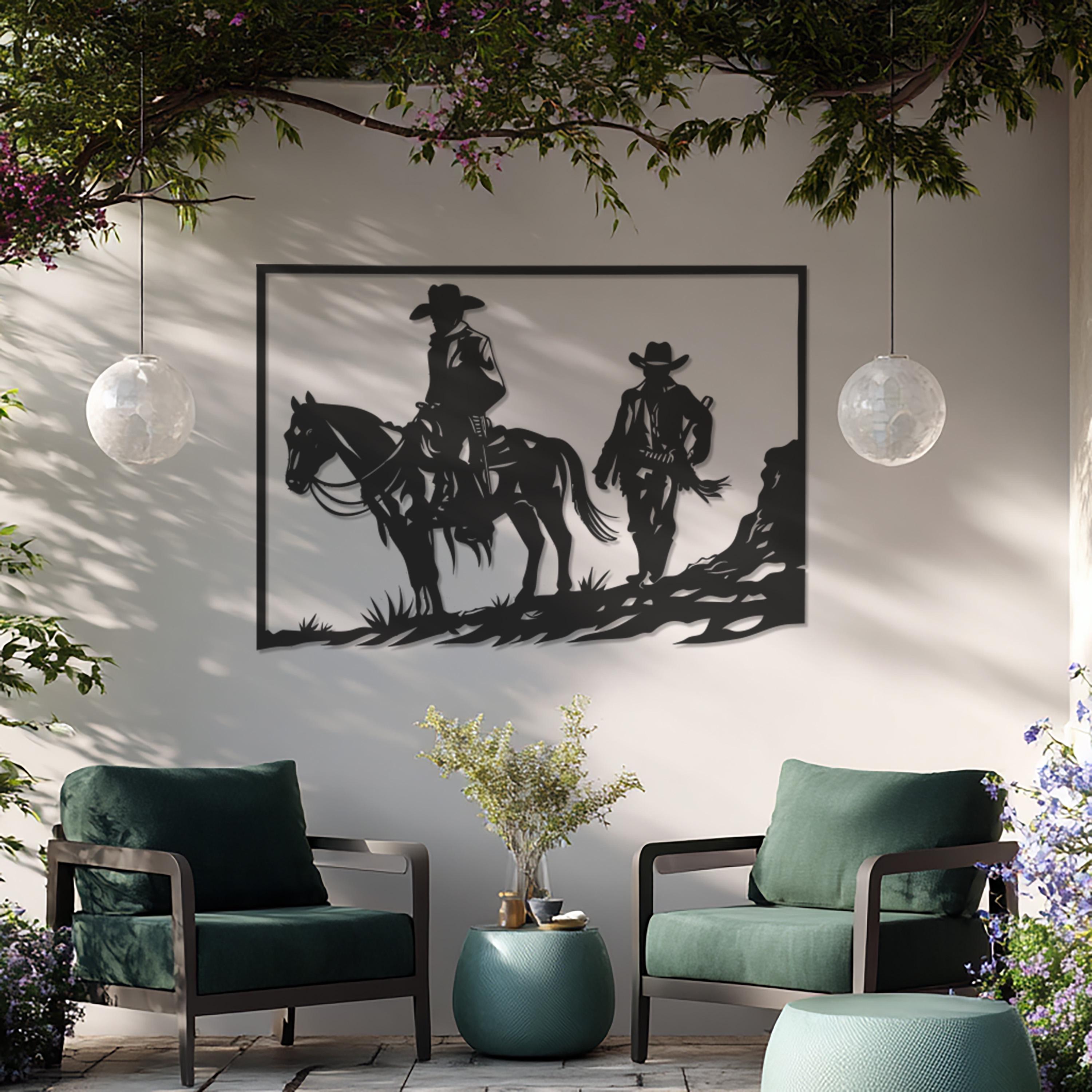 Capture the bold spirit of the Wild West with this Cowboy Metal Wall Art, featuring two cowboys and their loyal horses in a striking silhouette. Crafted from durable black metal, this piece brings a rustic yet refined touch to your home. Ideal for cabins, ranches, or Western-inspired interiors, it adds character and storytelling charm to any wall. A true homage to adventure, independence, and timeless Western culture.