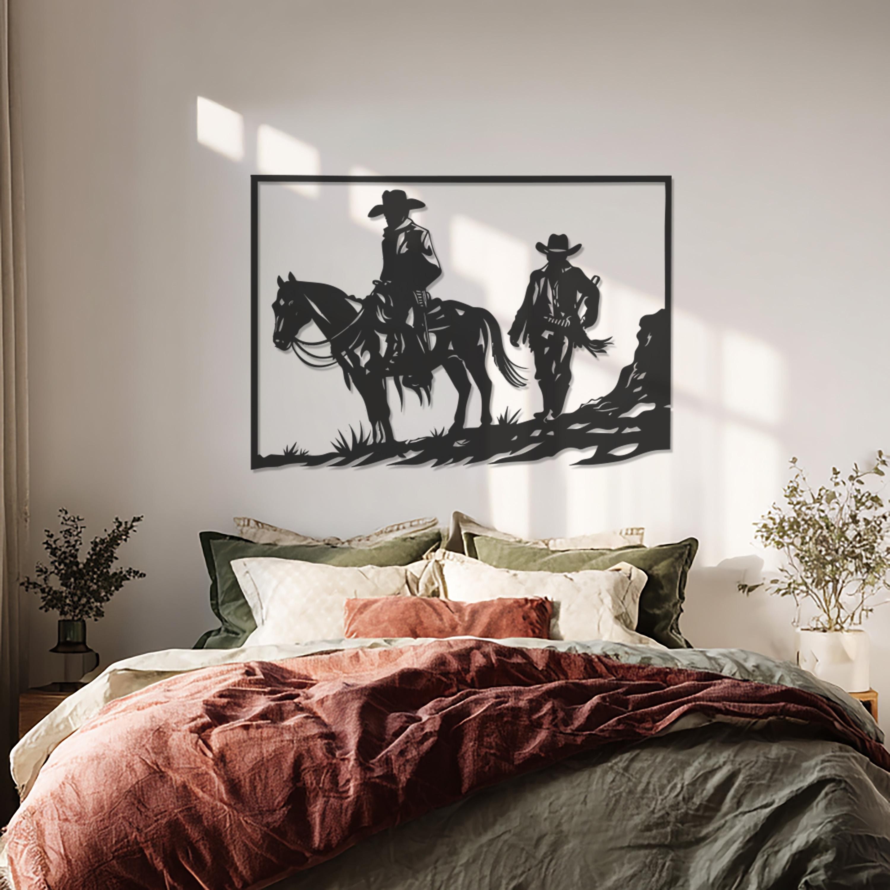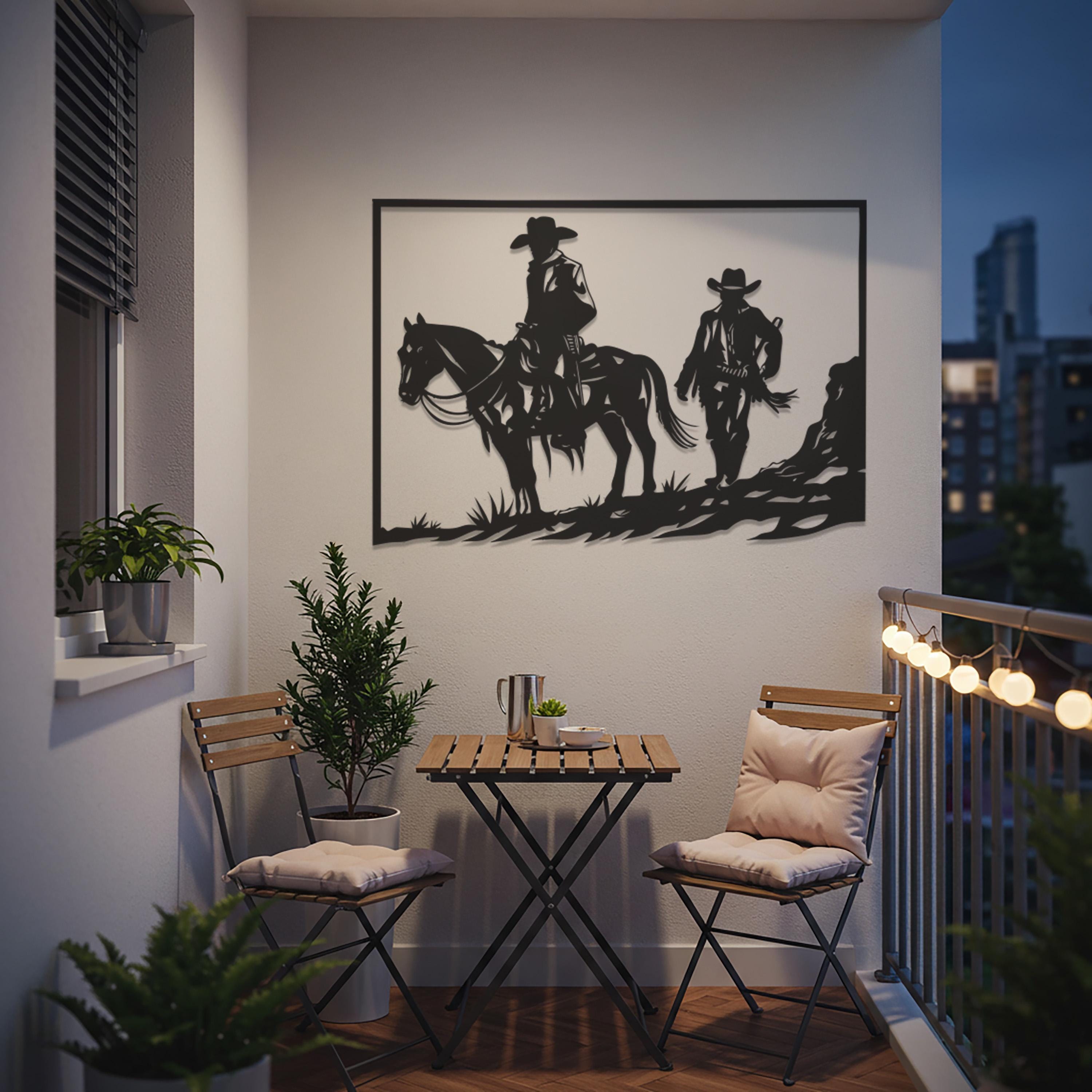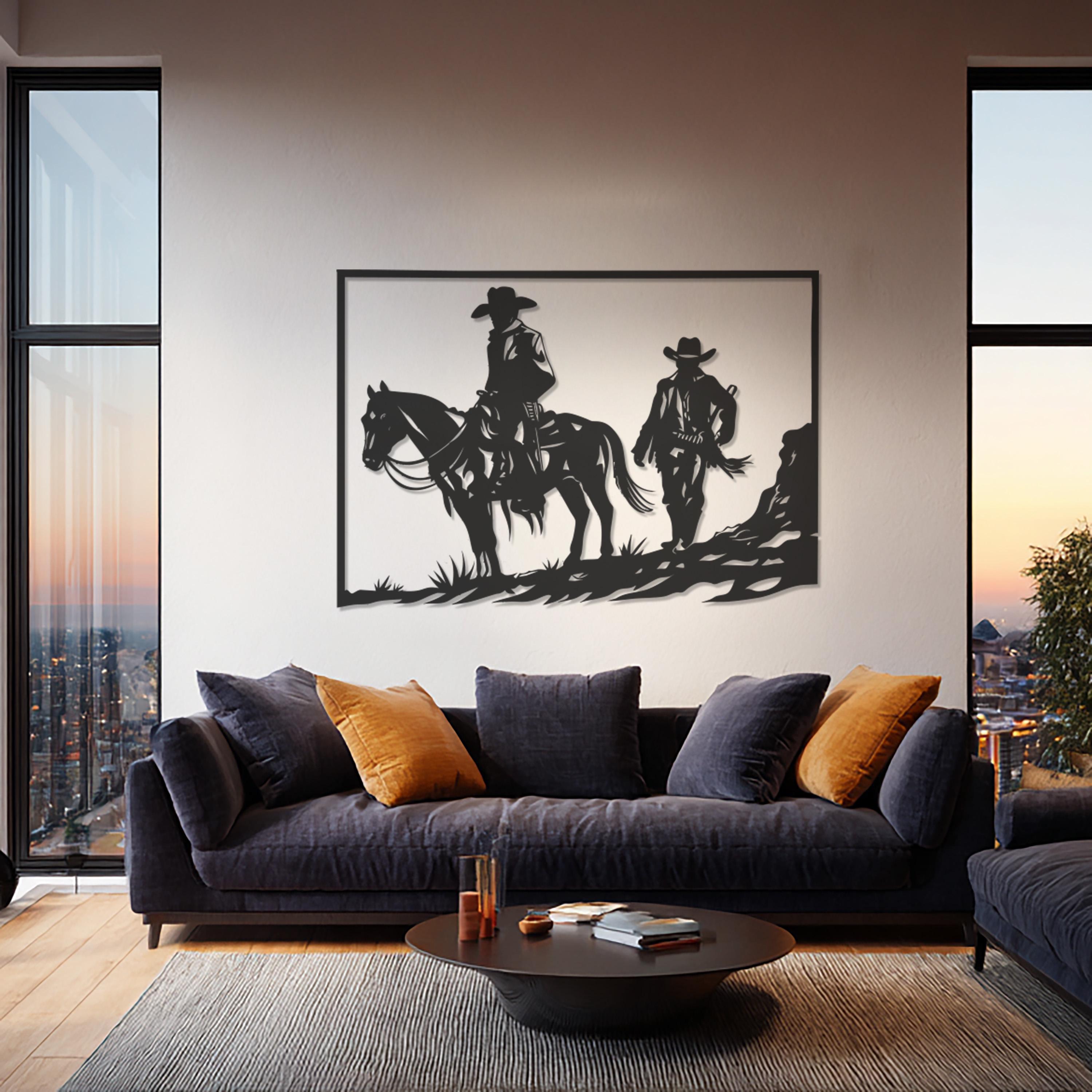Capture the bold spirit of the Wild West with this Cowboy Metal Wall Art, featuring two cowboys and their loyal horses in a striking silhouette. Crafted from durable black metal, this piece brings a rustic yet refined touch to your home. Ideal for cabins, ranches, or Western-inspired interiors, it adds character and storytelling charm to any wall. A true homage to adventure, independence, and timeless Western culture.