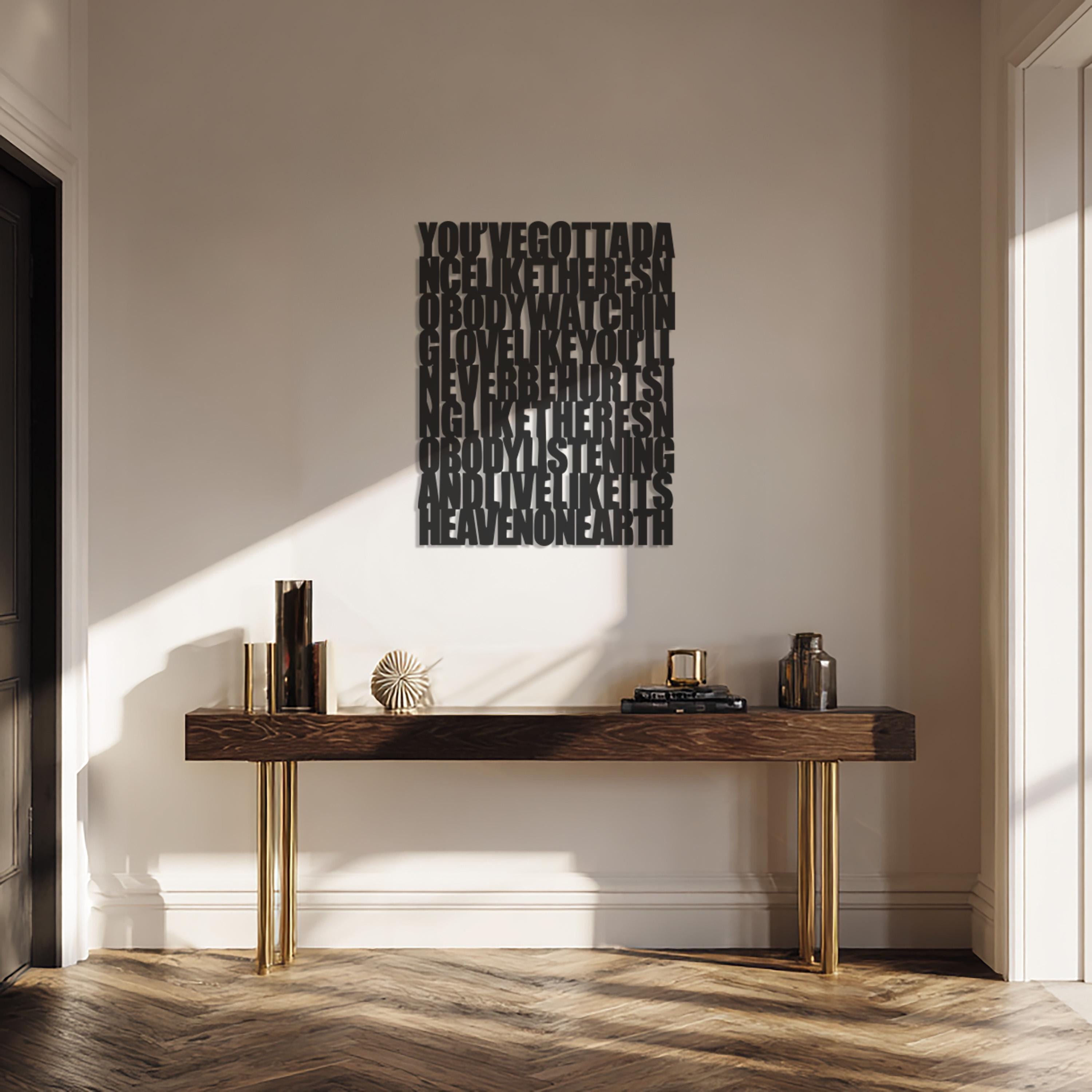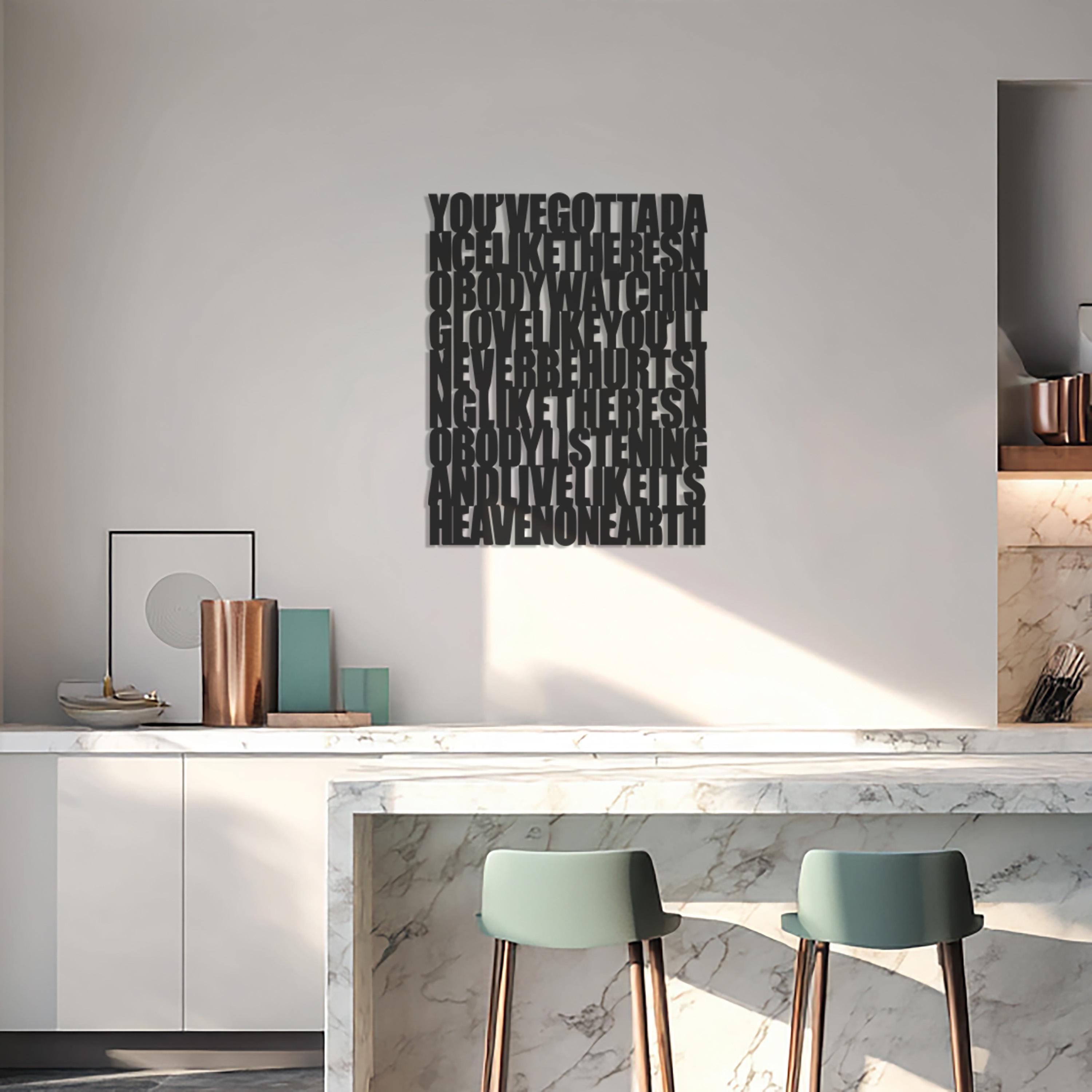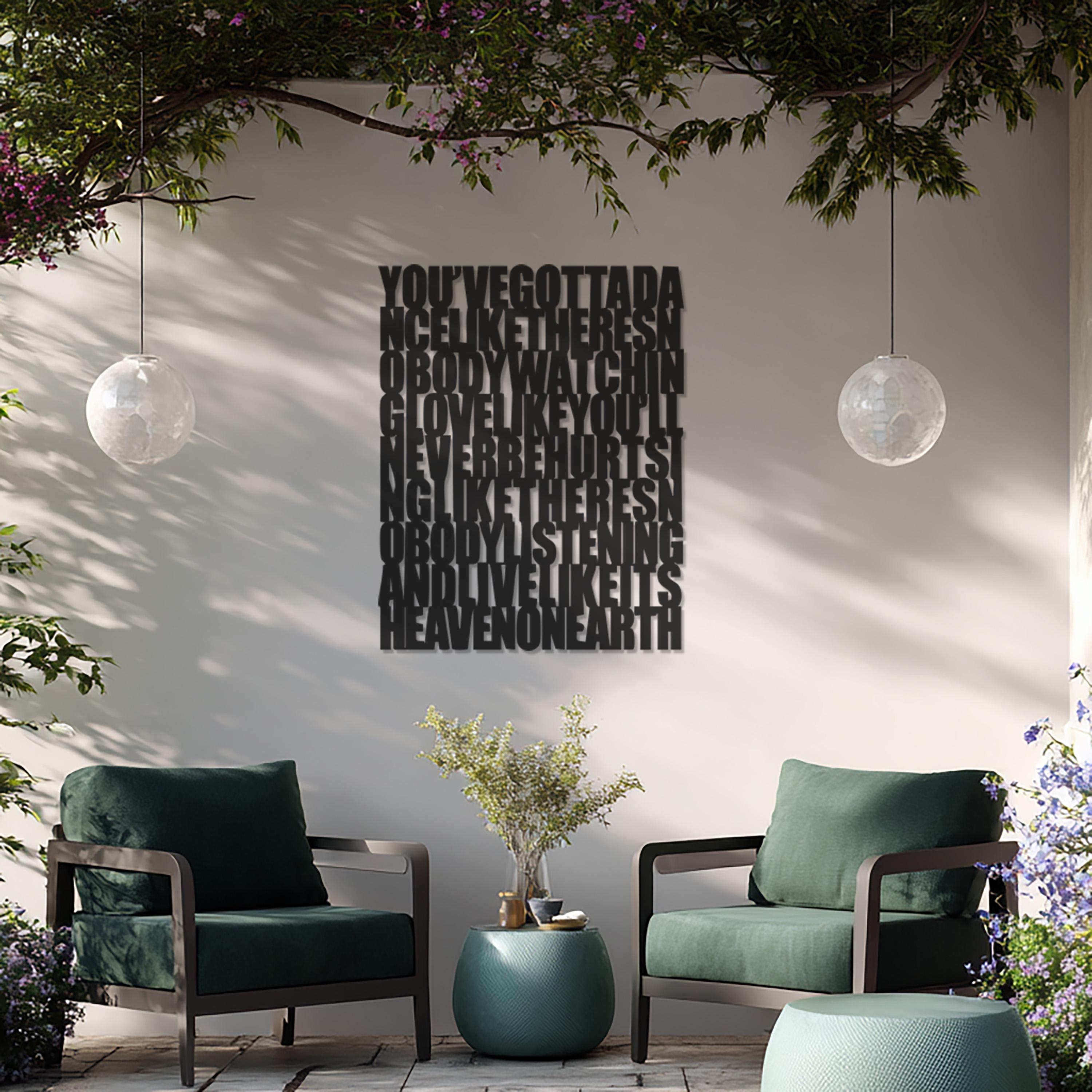 Inspire your daily life with this Inspirational Quote Metal Wall Art. Featuring elegant typography that reads “Dance like there’s nobody watching, love like you’ll never be hurt…”, this wall art brings positivity and motivation to any space. Perfect for modern interiors, it blends clean design with meaningful words — ideal for your living room, office, or bedroom. Crafted from high-quality matte black metal, it’s durable, stylish, and easy to mount.