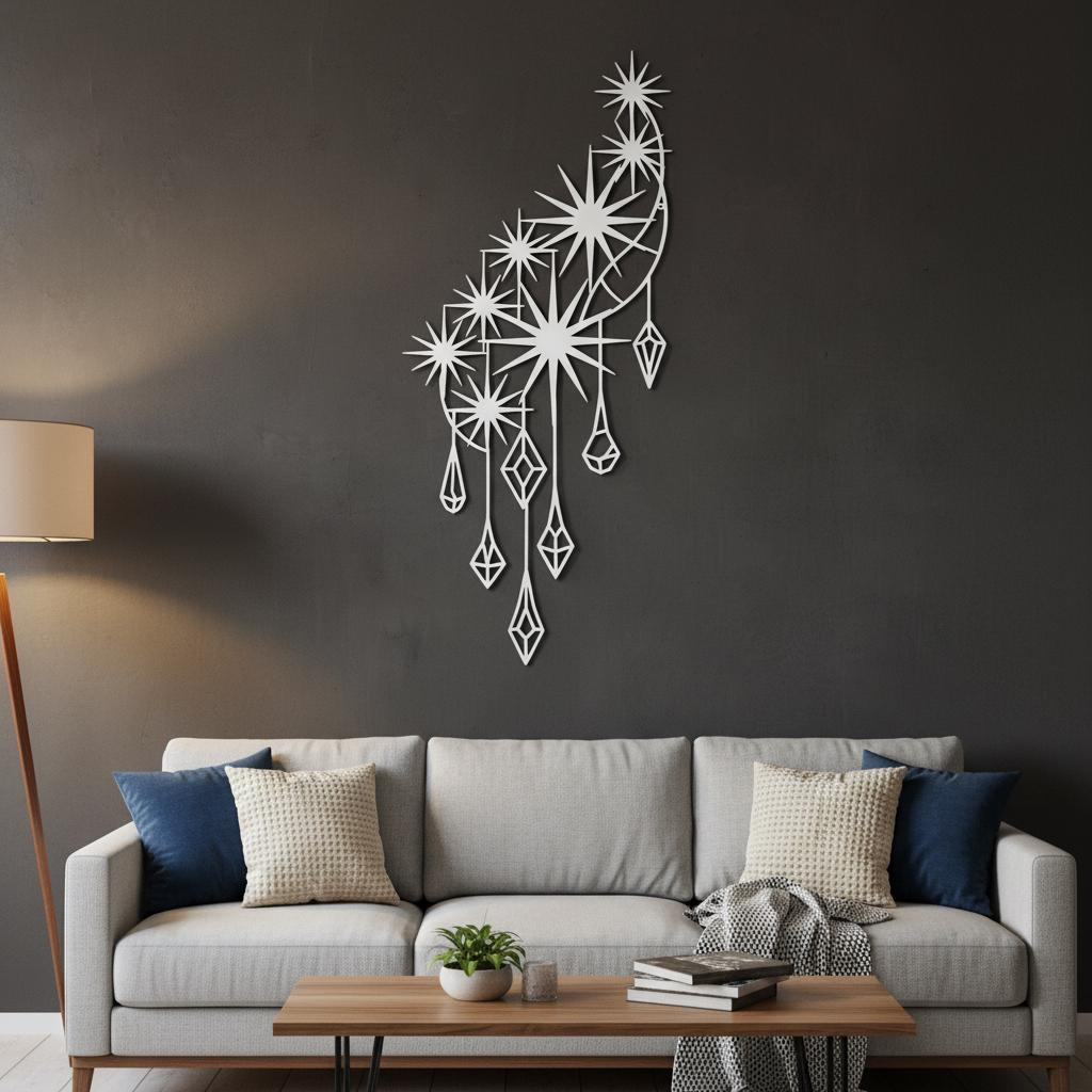 Illuminate your space with cosmic elegance using our captivating Celestial Moon Star Metal Wall Art. This enchanting statement piece features a mesmerizing crescent moon adorned with intricate geometric stars and sparkling hanging crystals, bringing balance, mystery, and a touch of celestial magic to any room. Expertly laser-cut from premium, durable matte metal, this modern indoor wall art effortlessly blends boho, modern, and celestial aesthetics. It's the perfect unique decor for bedrooms, living rooms, meditation spaces, or as a thoughtful housewarming gift.