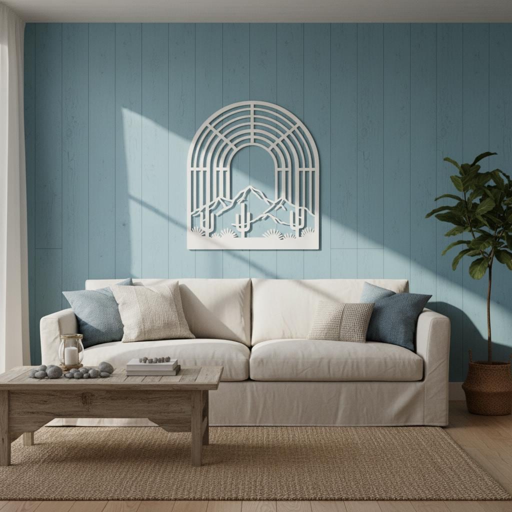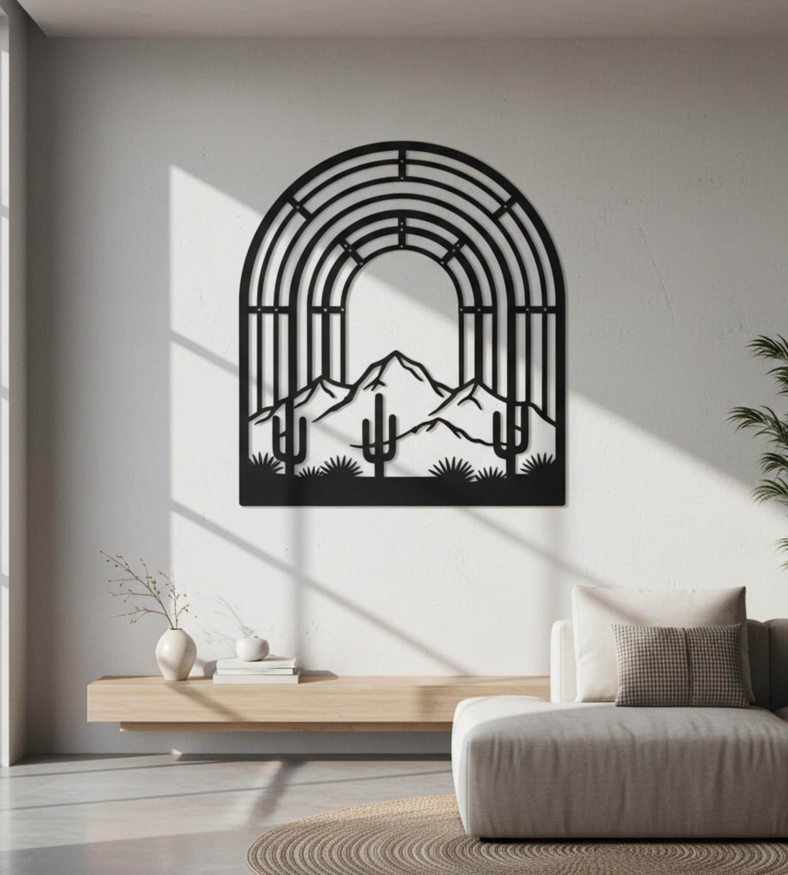 Immerse your space in warm desert minimalism with our captivating Desert Mountain Arch Metal Wall Art. This sculptural statement piece is inspired by majestic mountains, iconic cactus silhouettes, and a striking geometric rainbow arch. Expertly laser-cut from premium steel, this modern art piece blends architectural lines with natural desert calm, creating a serene focal point for airy, contemporary interiors. It’s the perfect blend of modern-boho style and Southwestern charm, designed to transform living rooms, entryways, or any space seeking a touch of serene landscape art.