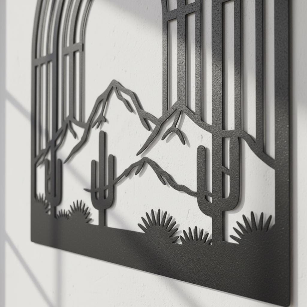 * Striking Desert Arch Design – Features a clean geometric arch framing detailed desert mountains and saguaro cacti, creating a captivating landscape.