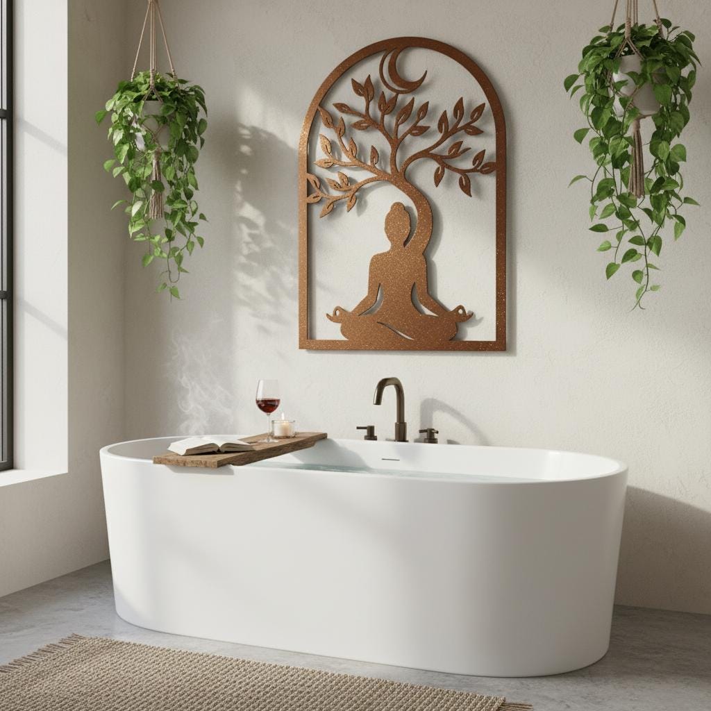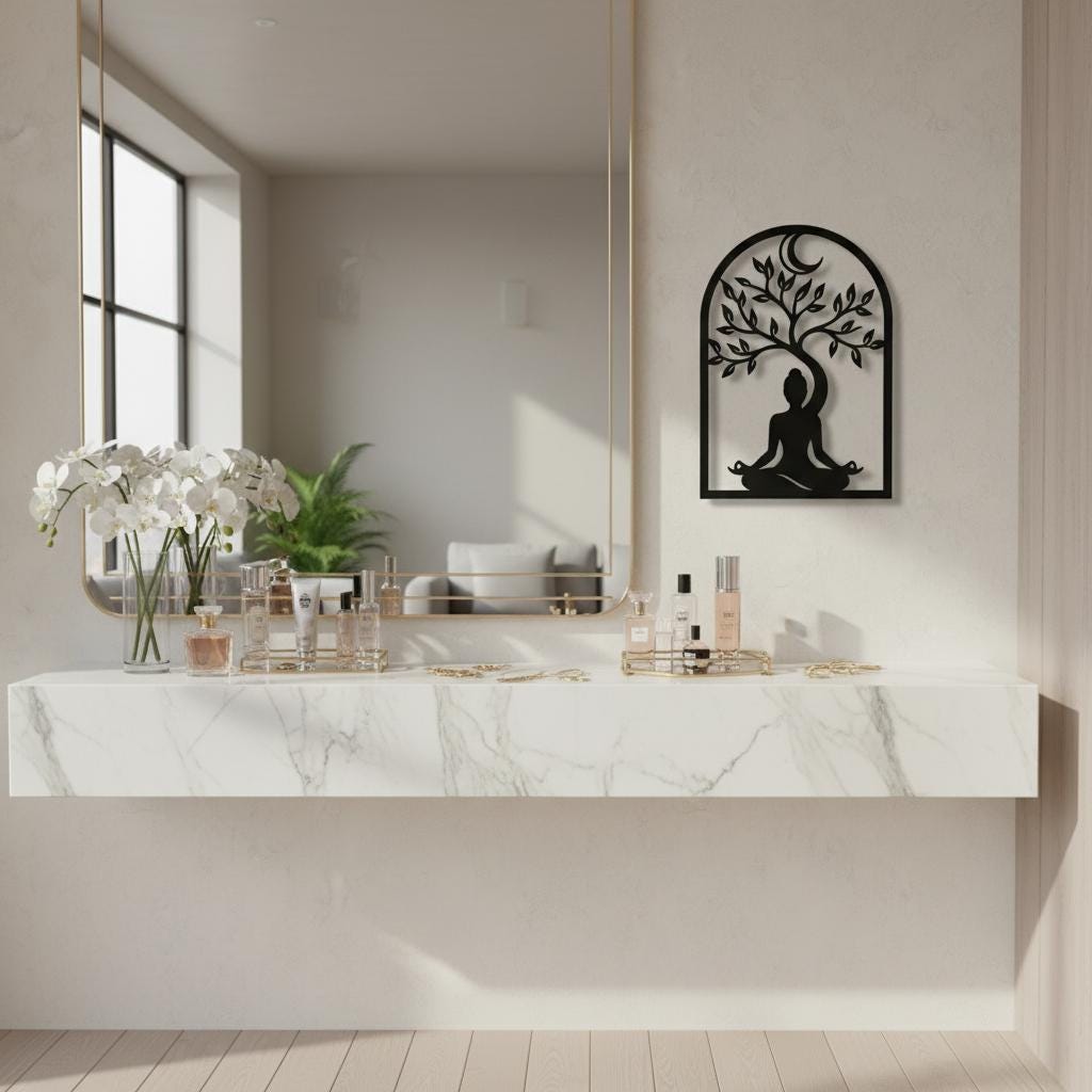 Create a sanctuary of calm and balance in your space with our captivating Meditation Tree Metal Art. This elegant silhouette features a peaceful meditating figure beneath a flowing tree and crescent moon, symbolizing mindfulness, growth, and inner harmony. Expertly laser-cut from premium, durable steel, this serene wall sculpture transforms bathrooms, spa-inspired interiors, yoga rooms, or modern living spaces into a haven of relaxation. It’s the perfect zen decor that beautifully blends spiritual calm with contemporary metal art.