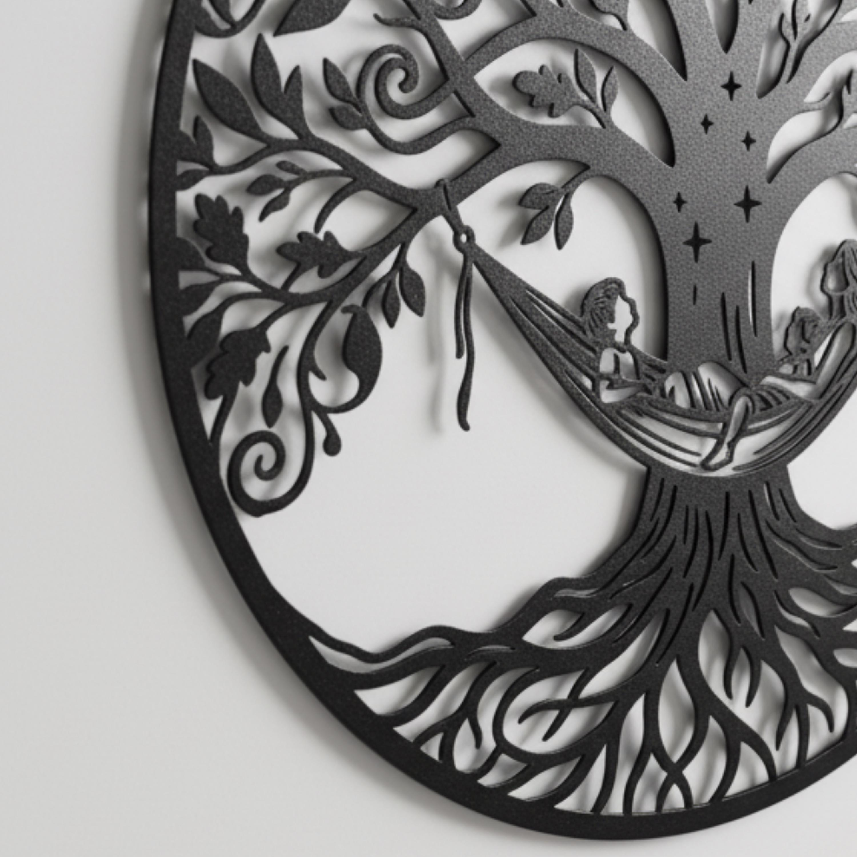 The silhouette features a wide-reaching canopy defined by rhythmic botanical cutouts, centered by a weightless hammock cradling a mother and her children. The intricate branches form a protective circle, balancing heavy linework with delicate star-shaped perforations along the primary trunk.
