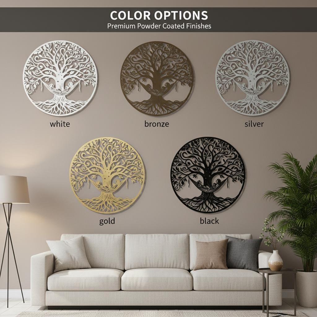 This Tree of Life metal decor captures a quiet moment between a mother and her children, resting beneath flowing branches. It reflects love, protection, and the calm strength of motherhood.